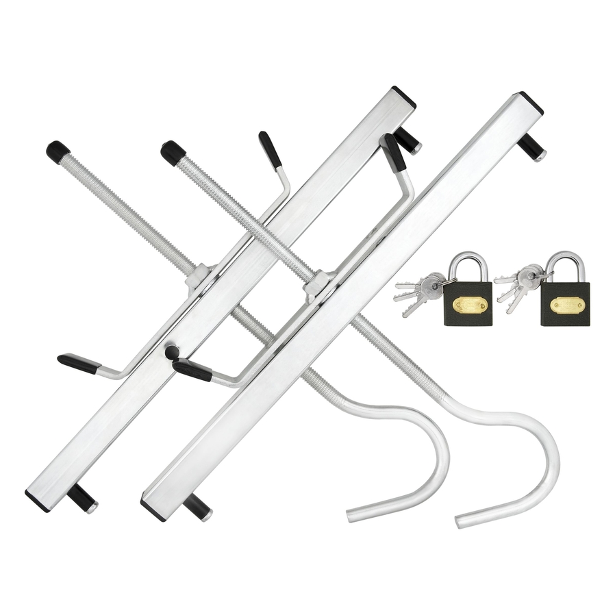 The indispensable accessory for securing ladders quickly and safely to a vehicle roof rack. Simple to use, these clamps are supplied in pairs and with a flick of the wrist, up to three ladders can be securely clamped to any roof rack and padlocked (2 padlocks included) for the ultimate in security…. the best selling ladder accessory ever……. these great clamps secure your ladder in seconds …. no van is complete without a set.