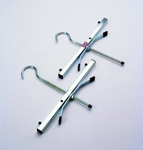 A Sturdy pair of stabiliser legs which quickly attach to most ladders to give superb added lateral stability and anti back-slip properties and enable you to work safely at height. Manufactured here in the UK from strong electro-plated steel, these legs are adjustable to fit most extension ladders and clamp on quickly with the aid of large easy turn hand wheels.