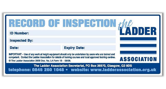 The Ladder Association is ‘The recognised authority in the UK’ when it comes to anything to do with Ladders and Ladder safety. This self-adhesive Inspection record system is specifically designed by the Ladder association for Ladders and Stepladders. The use of this record allows users to see at a glance if the ladder/stepladder is ready for use and when the last inspection was carried out.