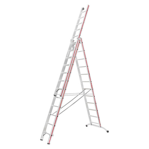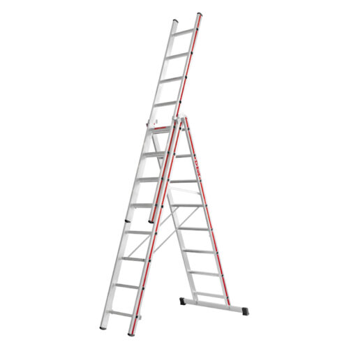 Hymer aluminium combination ladders offer four ladders in one sturdy, versatile unit. Perfect for use as an extension ladder, ‘A’ frame ladder, stairway ladder and stepladder. Manufactured in Germany with 5 year and 10 year guarantees depending on model, this superb range of quality combination ladders feature comfortable 30mm deep rungs and sturdy box section stiles. Another safety feature of these aluminium triple-section combination ladders are their rigid locking braces, designed to enhance stability and rigidity, a feature usually found only on premium priced ladders. Designed and manufactured to fully comply with the latest European and British safety standards EN131 for professional use, these superb ladders could easily replace many different pieces of equipment, making your life so much simpler and convenient.Â
