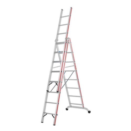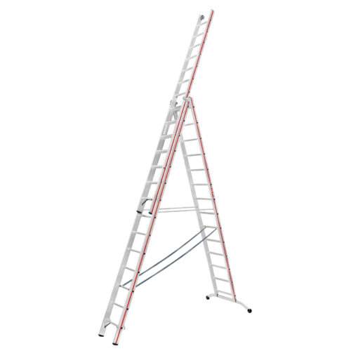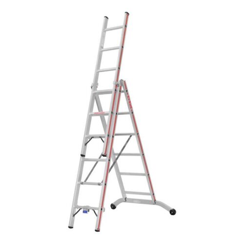Hymer aluminium combination ladders offer four ladders in one sturdy, versatile unit. Perfect for use as an extension ladder, ‘A’ frame ladder, stairway ladder and stepladder. Manufactured in Germany with 5 year and 10 year guarantees depending on model, this superb range of quality combination ladders feature comfortable 30mm deep rungs and sturdy box section stiles. Another safety feature of these aluminium triple-section combination ladders are their rigid locking braces, designed to enhance stability and rigidity, a feature usually found only on premium priced ladders. Designed and manufactured to fully comply with the latest European and British safety standards EN131 for professional use, these superb ladders could easily replace many different pieces of equipment, making your life so much simpler and convenient.Â