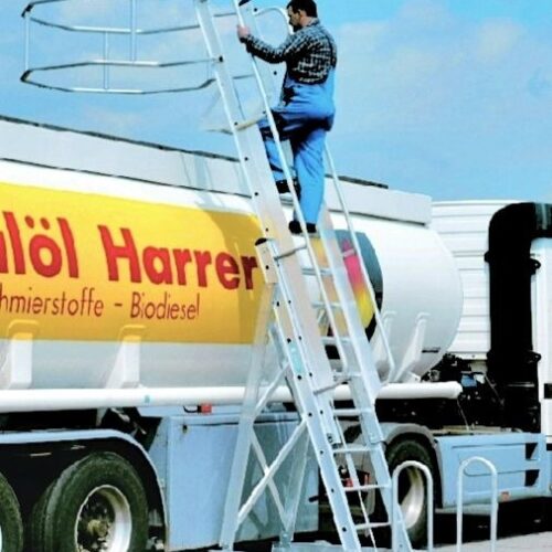 Zarges Tanker Ladders are specifically designed for accessing,servicing, repairing, filling and cleaning road tankers or any large vehicle with a roof designed to take the weight of a person.. These mobile ladders are used primarily on road tankers in a range of different industries, this includes; the food industry, the chemical and petrochemical industries and on rail vehicles. This tank access ladder comprises a two part extension ladder with a maximum load of 150 kg, which is conveniently height adjustable via a side-mounted winch from ground level. The ladder is totally self supporting and so will not damage bodywork or livery. The basic design can be configured or modified to suit your individual requirements as each tanker ladder is built to order.