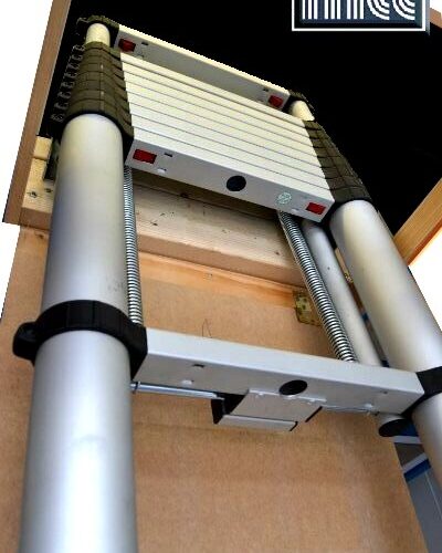 • The Motora electric concertina loft ladder is manufactured from white powder coated sheet steel and stores completely within the hatch space.