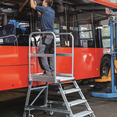 - Ready-for-use in no time through a central foot-operated brake on the access steps.