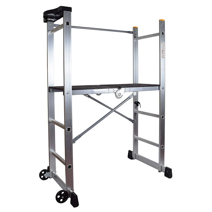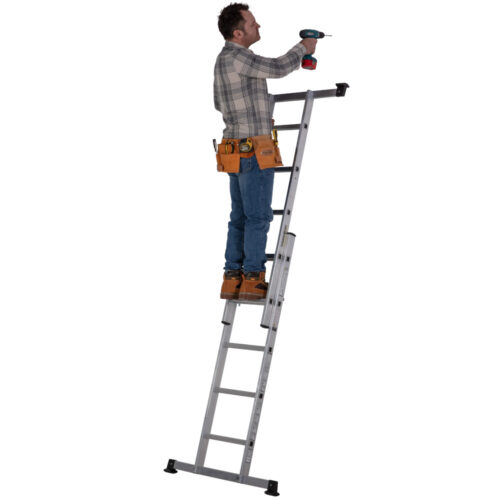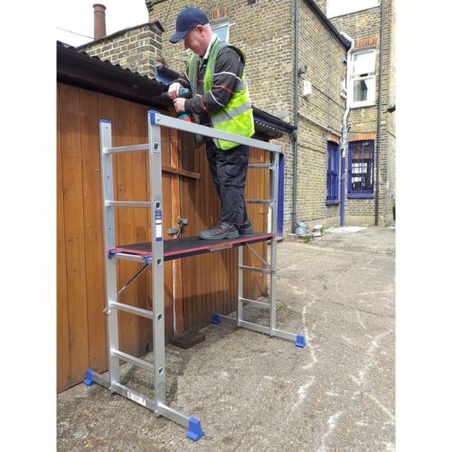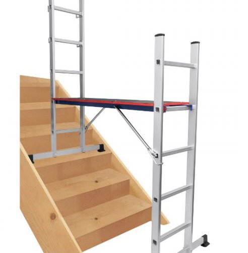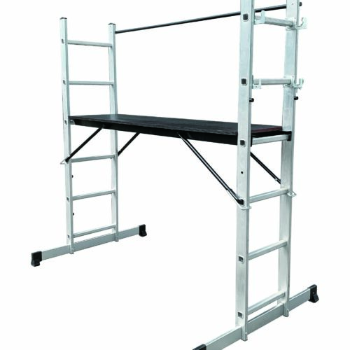 A great quality multi-purpose combination ladder and work platform in one unit…Built and designed for trade use… this unit carries the European EN131 standard with a load rating of 150kg (23.5st) The picture shows the ladder in work platform mode … but this versatile unit does so much more…two small ladders, double extension ladder, ‘A-frame’ step ladder, scaffold platform and a really useful stairway scaffold…