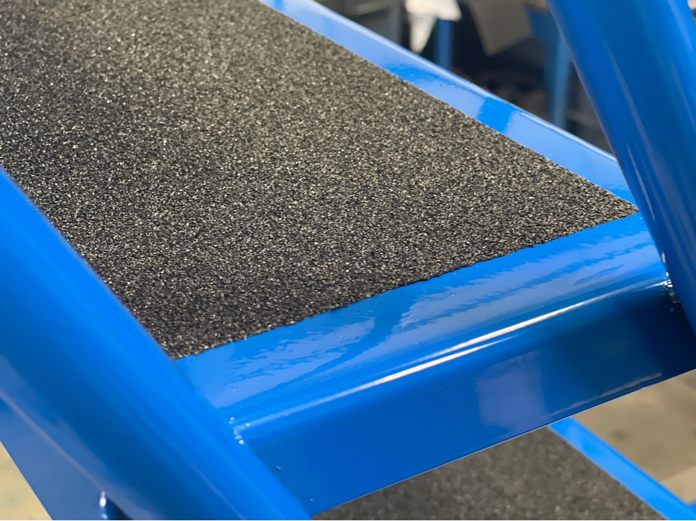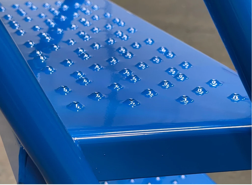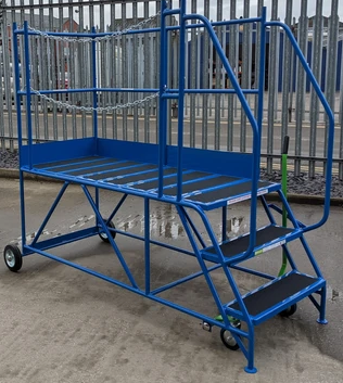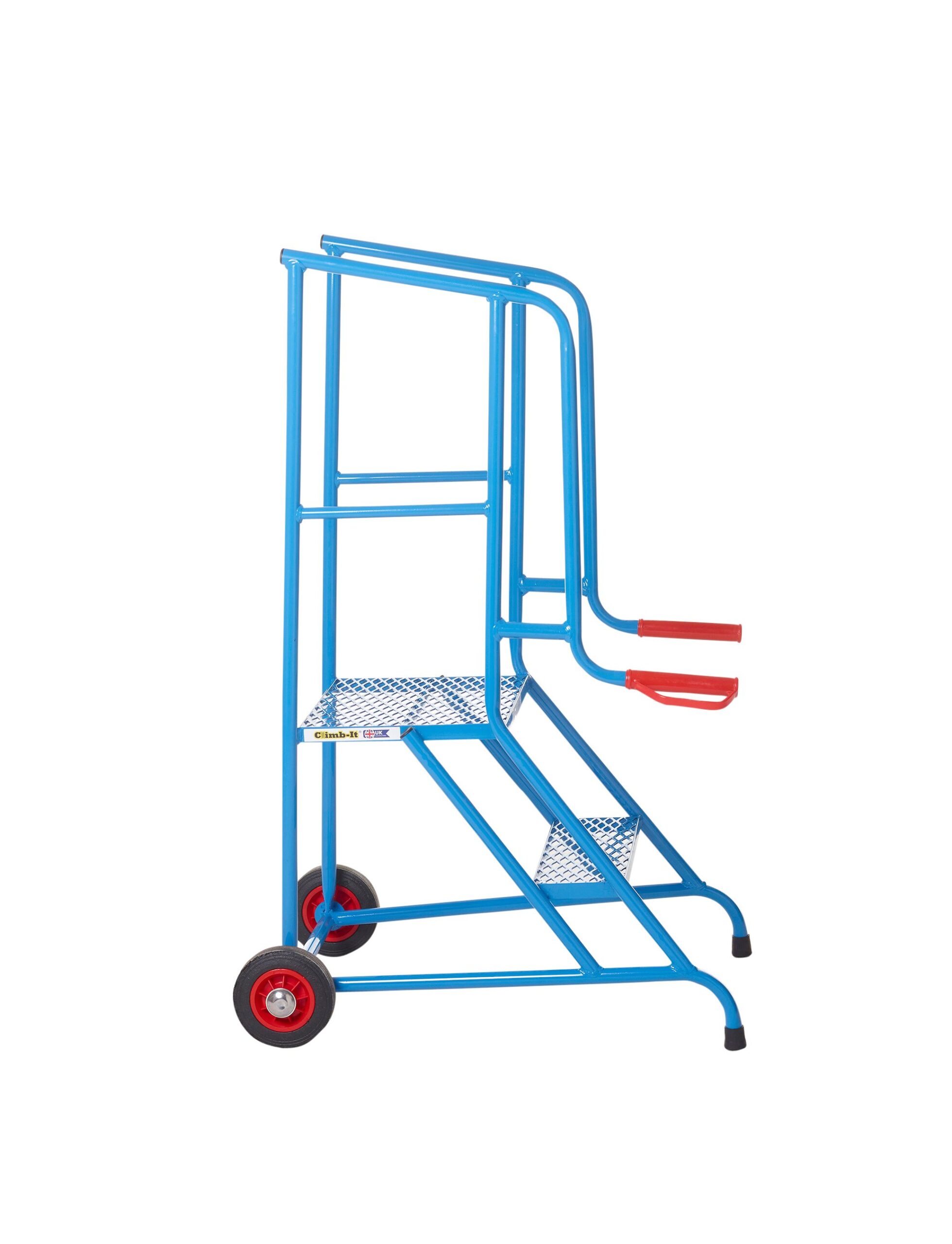 Manufactured here in the UK by Klim-ezee these units are built to last… heavy duty welded steel construction finished in a hard wearing, baked epoxy powder coated finish, they are available in a range of popular colours. 2 and 3 tread models are fitted with side handle braking system, while 4 to 8 tread models sport the signature central anti-ascent brake which prevents access onto the stairs while the unit is mobile. The platform width is a very generous 700mm and all tread surfaces have a punched and raised anti-slip surface for superb grip in any footwear and environment… all models feature kick plates to the closed side and end. The work area features 1.0m guardrails to the end and closed side and a removable chain to the open side. The work area is 700mm wide x 1600mm long, and with reinforced treads, will support a safe working load of 500kg.