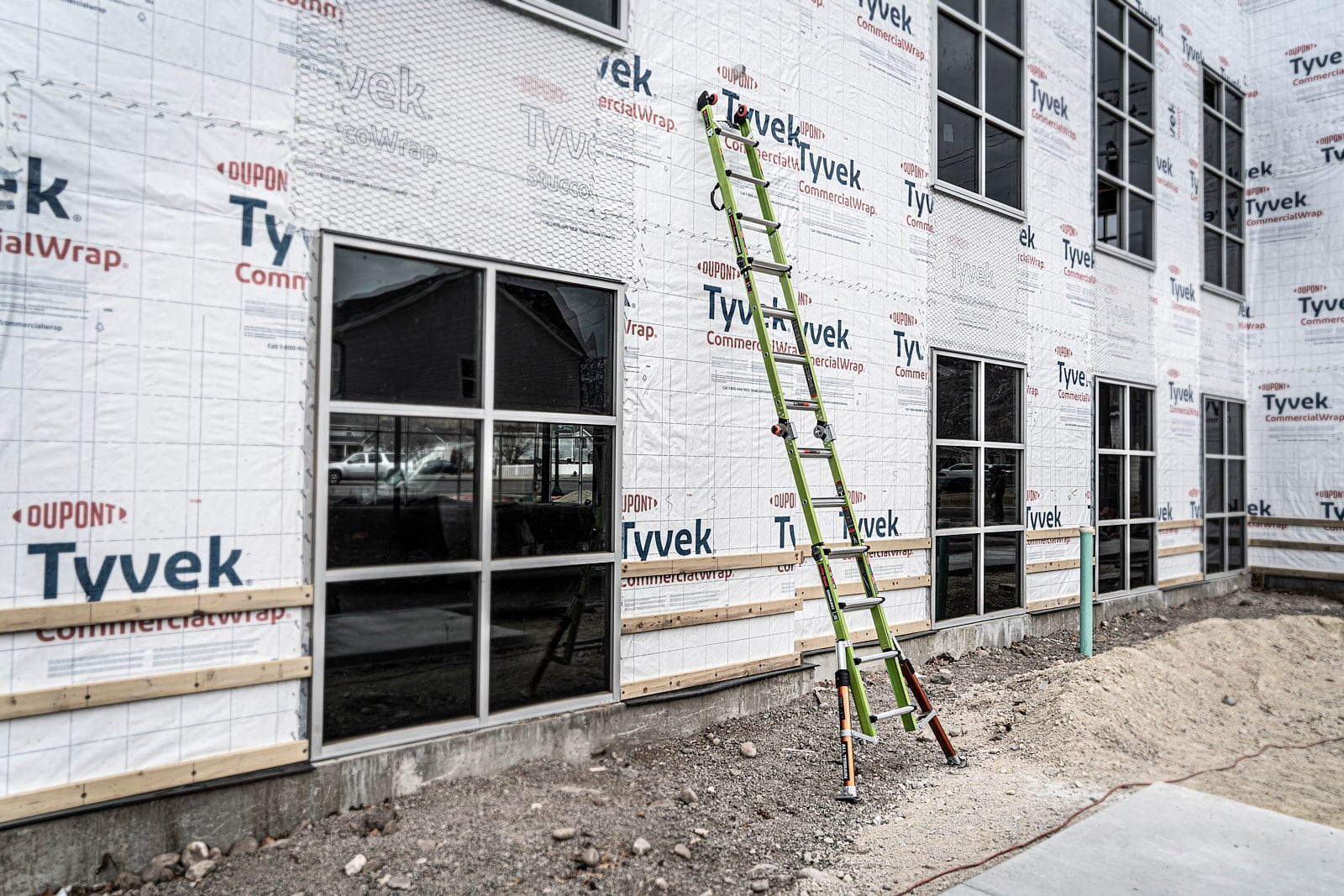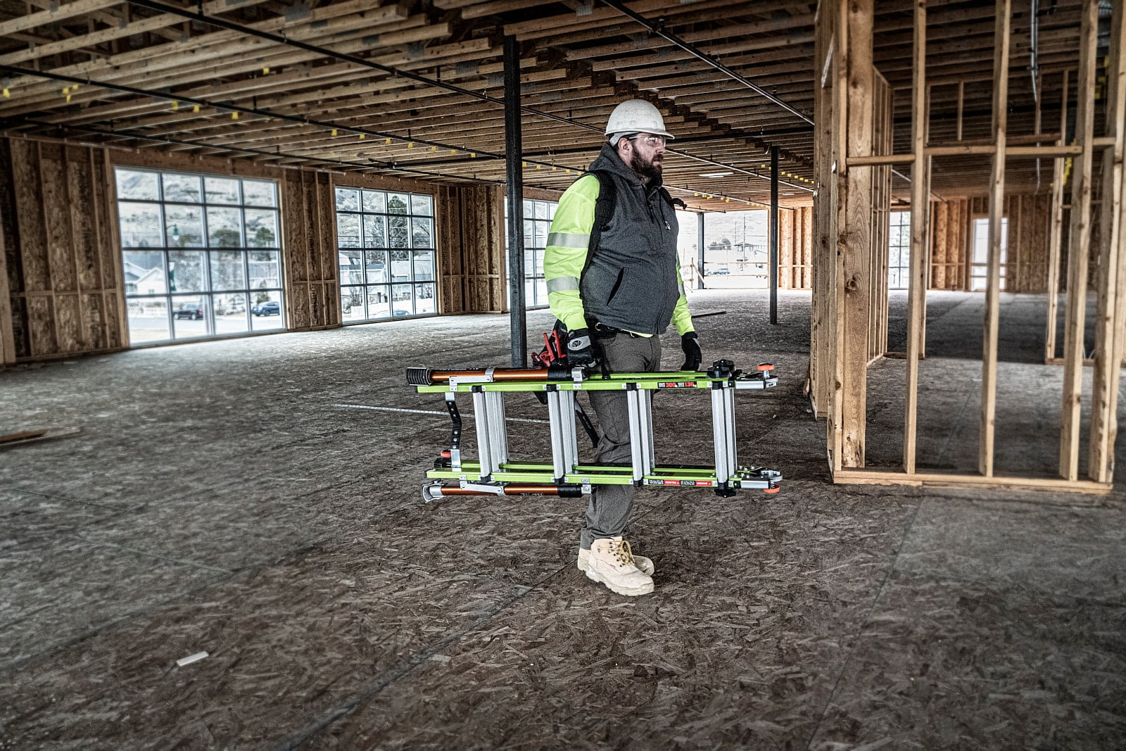 Grip and squeeze the side-mounted legs, which are independent, to level the ladder on rough or uneven ground. Grip and twist the Rapid Lock, then slide the ladder rails to the desired size. Twist the Rapid Lock once more to lock the ladder in place. Move from storage to A-frame, extension and 90-degree configurations by pushing the ladder’s palm buttons. The integrated Tip & Glide wheels help you move the ladder quickly from job to job.