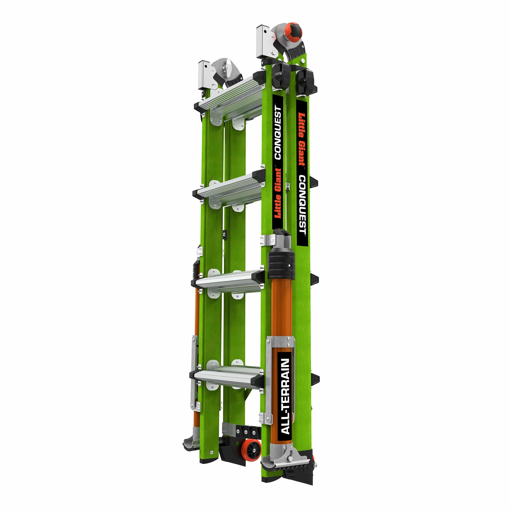 An Intense job calls for an intense tool. The Little Giant® Conquest GRP All-Terrain™ ladder helps you complete those heavy-duty tasks. From roofing to painting to general maintenance, the Conquest is the ladder to help you get stuff done. Conquest is an all-new ladder to the UK. It was redesigned from the ground up to be not only easier to use but safer. Brimming with safety features, including the side-mounted stabiliser bars that keep you level, no matter what the ground you’re working from looks like. The Tip & Glide™ wheels help you move the ladder quickly from job to job. Like all Little Giant Ladders, the Conquest All-Terrain is designed to help you work quickly and effectively, since it can be used in multiple positions. Use the Conquest in the stepladder, extension, staircase, or 90-degree position, depending on the needs of the job.