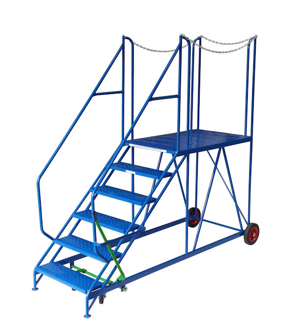 Tread size throughout the range is 700mm x 200mm and the top platform is 700mm wide x 400mm deep but can be increased. Treads are punched & raised for ultimate anti-slip resistance… all models are fitted with full length double handrails, kicking plate, fail-safe anti-ascent brake and large rubber tyred rear wheels as standard, while the optional features listed below can be specified at extra cost… call us on 0300 303 22 99 for a quotation on your special requirements.