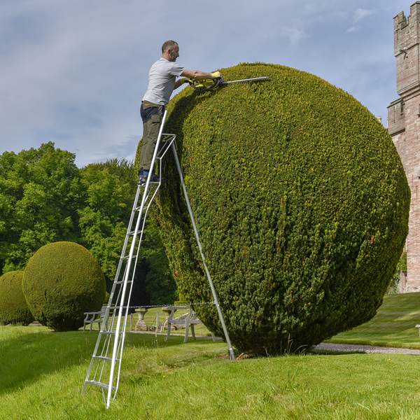 The third leg is telescopic, and the ladder easily straddles over shrubs and low fences and walls, so depending on the task you can work face-on with the third leg planted into a hedge, or sideways with the side of the base parallel to the task, giving the perfect working position. A flat top allows you to rest baskets or tools. Made from welded extruded aluminium, the ladder is lightweight yet strong, handling a maximum working load of 150kg (23.5st).