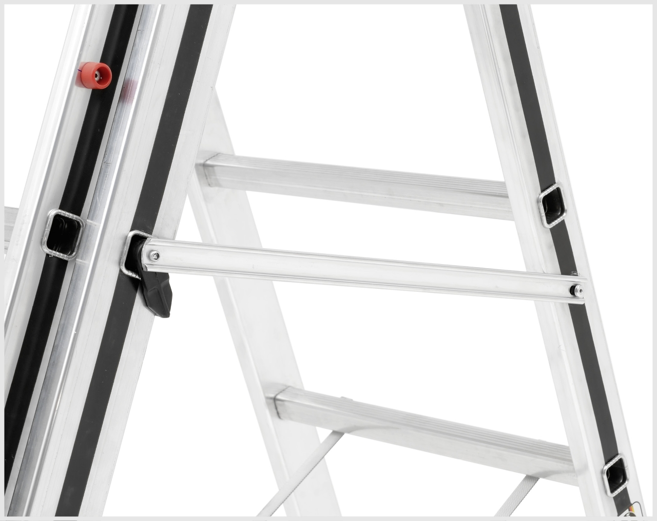 Hymer black line aluminium combination ladders offer four ladders in one sturdy, versatile unit. This 3 x 8 rung model offers working heights of up to 5.96m and is perfect for use as an extension ladder, ‘A’ frame ladder, stairway ladder and stepladder, and features the amazing ‘Smart Base’ foot-operated levelling stabiliser for instant easy adjustment on uneven ground or steps. Manufactured in Germany with a 5-year guarantee, this range of quality combination ladders feature comfortable 30mm deep rungs and sturdy box section stiles. Another safety feature of this aluminium triple-section combination ladder is its rigid locking brace, designed to enhance stability and rigidity, a feature usually found only on premium priced ladders. Designed and manufactured to fully comply with the latest European and British safety standards EN131 for professional use, these superb ladders could easily replace many different pieces of equipment, making your life so much simpler and convenient.