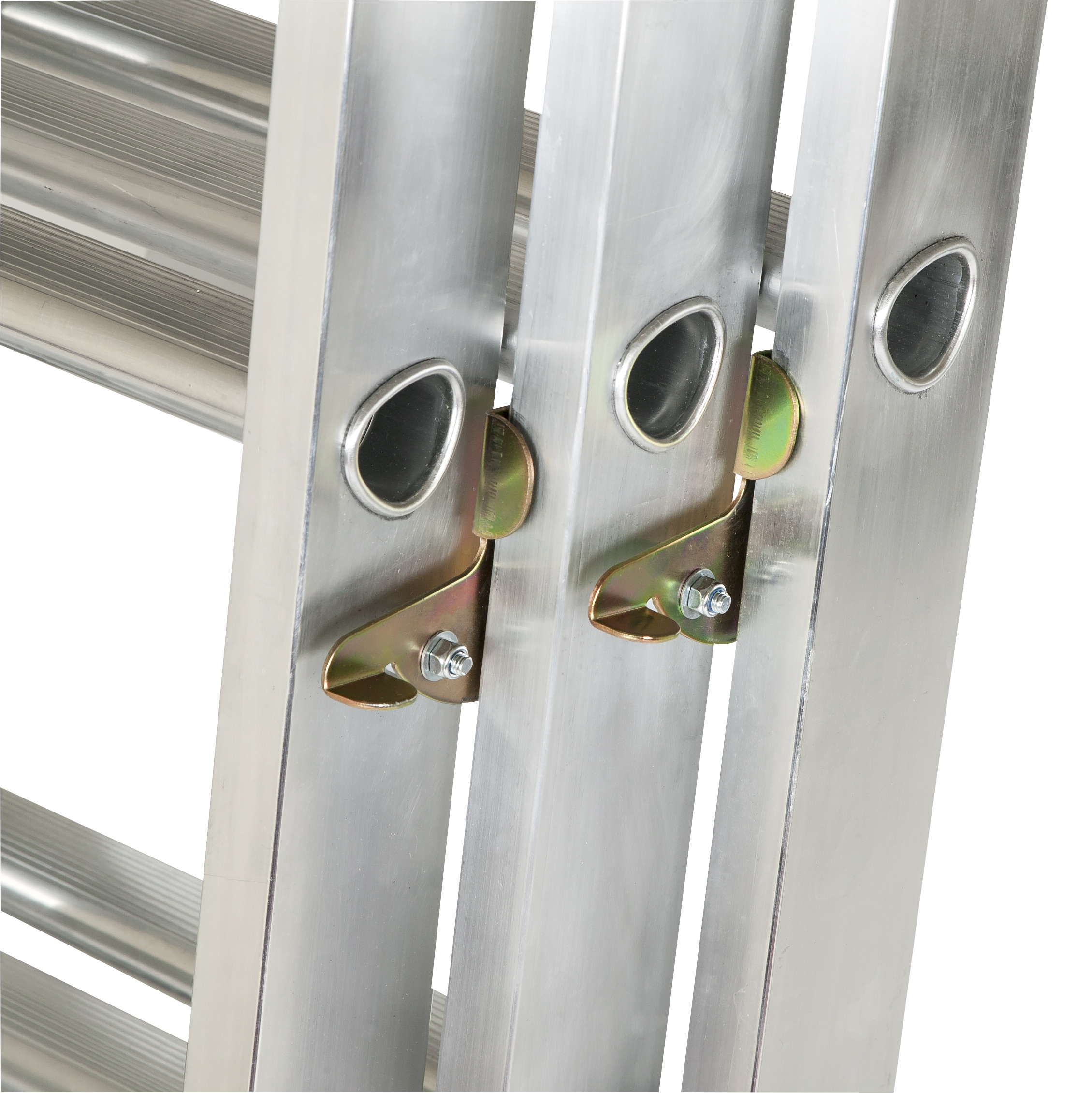 Featuring all aluminium construction, they are lightweight and comfortable to use, with strong box section stiles and flat-topped D-shaped rungs with a deep anti-slip tread pattern. All top brackets and bottom hooks are produced from extruded aluminium for lightness and corrosion resistance and all sections are fitted with non-slip moulded PVC end caps and now featuring a wide base stabiliser fitted as standard to comply with BSEN131 2018, the latest British & European Ladder standard, and with a max load rating of 150kg (23.5 stone) they are ideal for occasional use by the DIY enthusiast or homeowner. Available in a range of useful 2 and 3 section sizes.
