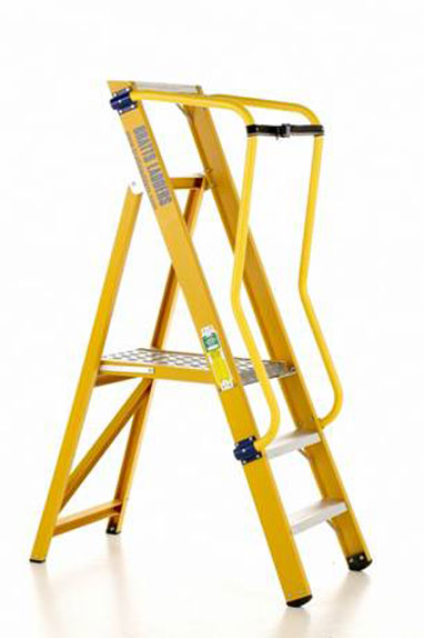 Ergonomically designed for industrial use, the superb fibreglass VISION 360 is insulated and non-conductive whilst in use and HSE compliant to work two-handed for up to 30 minutes. Manufactured from distinctive yellow 85mm x 31mm stile channel and 45mm x 35mm back leg channel, the steps are tested and Kitemarked to BS EN131 and comply to – ANSI 14-5 and ESI 13-1. The steps have a glass fibre frame with aluminium treads incorporating a large – 400mm wide by 550mm long – platform which folds away when not in use.ย The platform locks into position and will support a max load of 150kg (23.5st) and is enclosed on 3 sides for safety by dual aluminium handrails (yellow plastic coated handrails may be specified). An optional extra security webbing strap can be bought with the steps to close off entry/exit (choose from options when adding to cart)