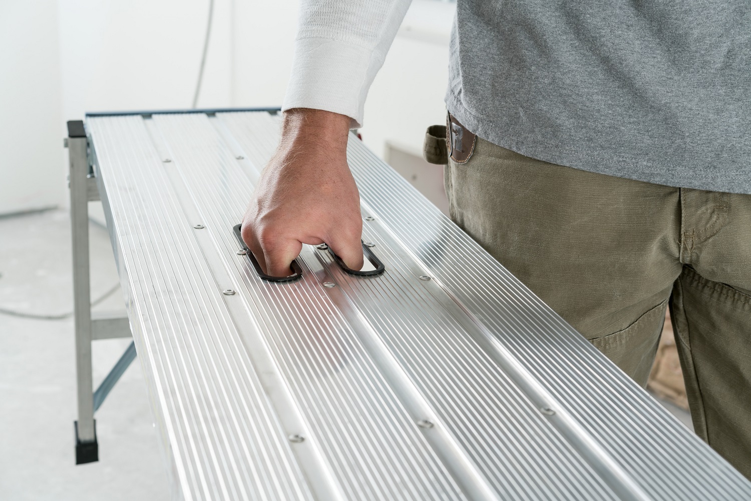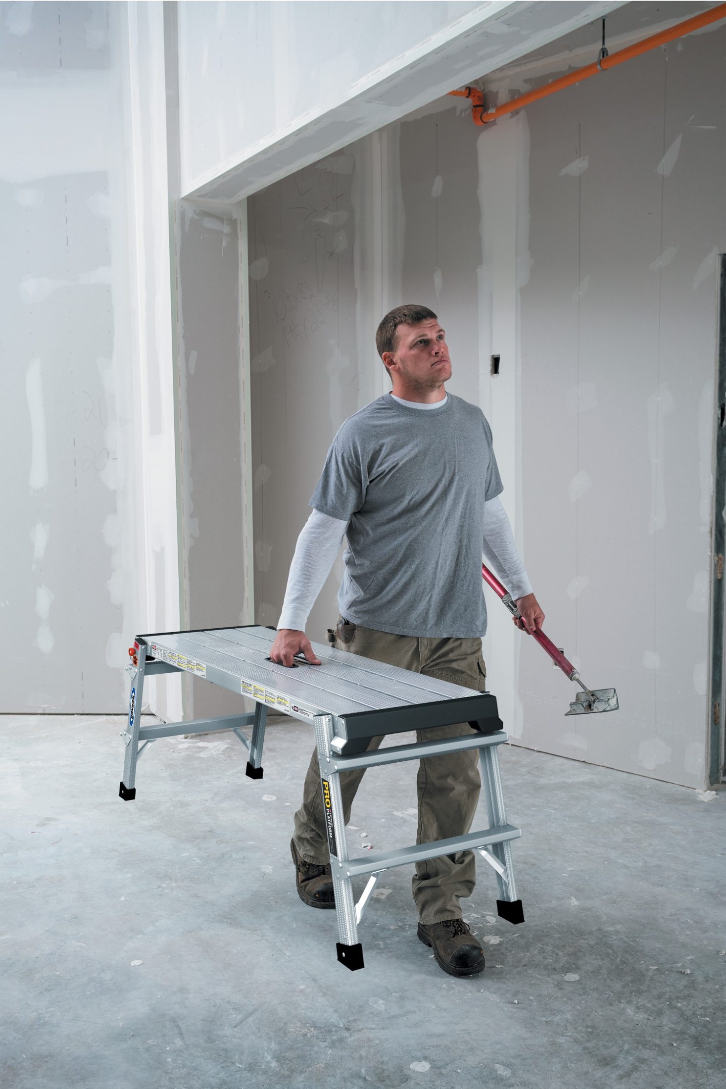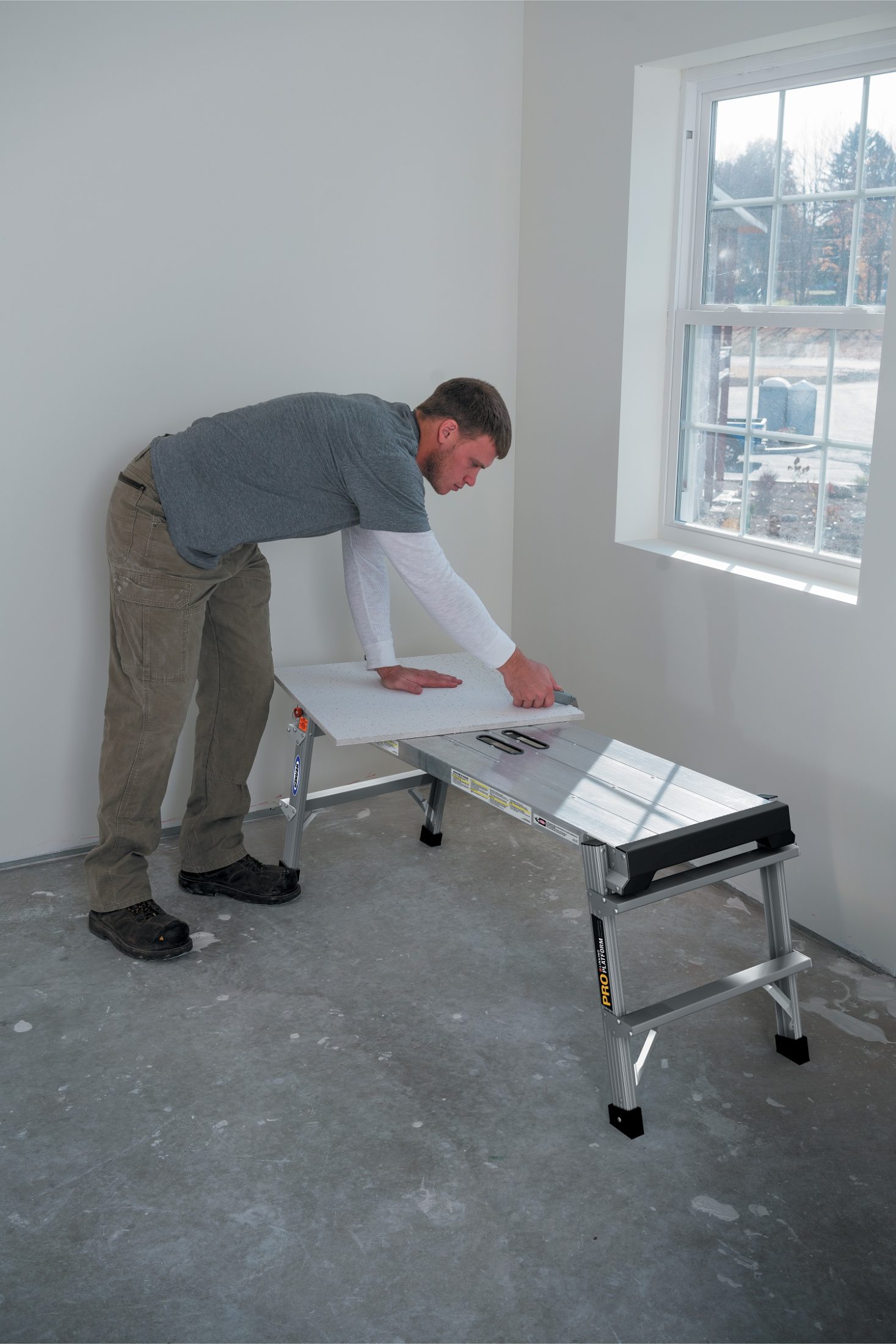 With a unique Link System to connect up to four 79035 work platforms together, the Linking Work Platform is ideal for professionals who need a larger work surface. The slim fold dual locking legs securely lock when the legs are opened for safety and then lock again when closed for easy transport and storage. The Easy-Grabโข handle allows you to transport the platform in one hand while holding supplies in the other. This work platform folds completely flat when closed for easy transportation and storage.