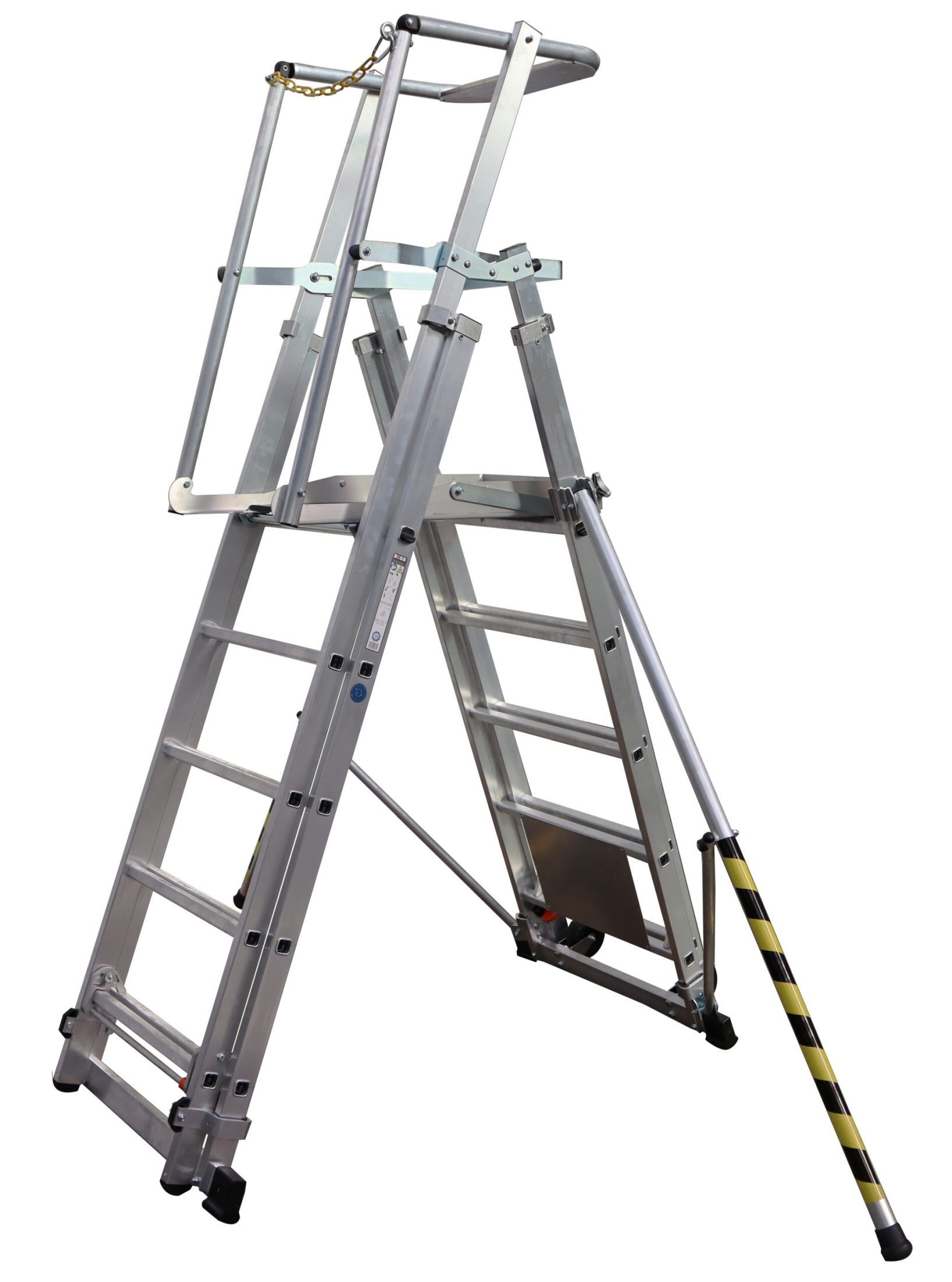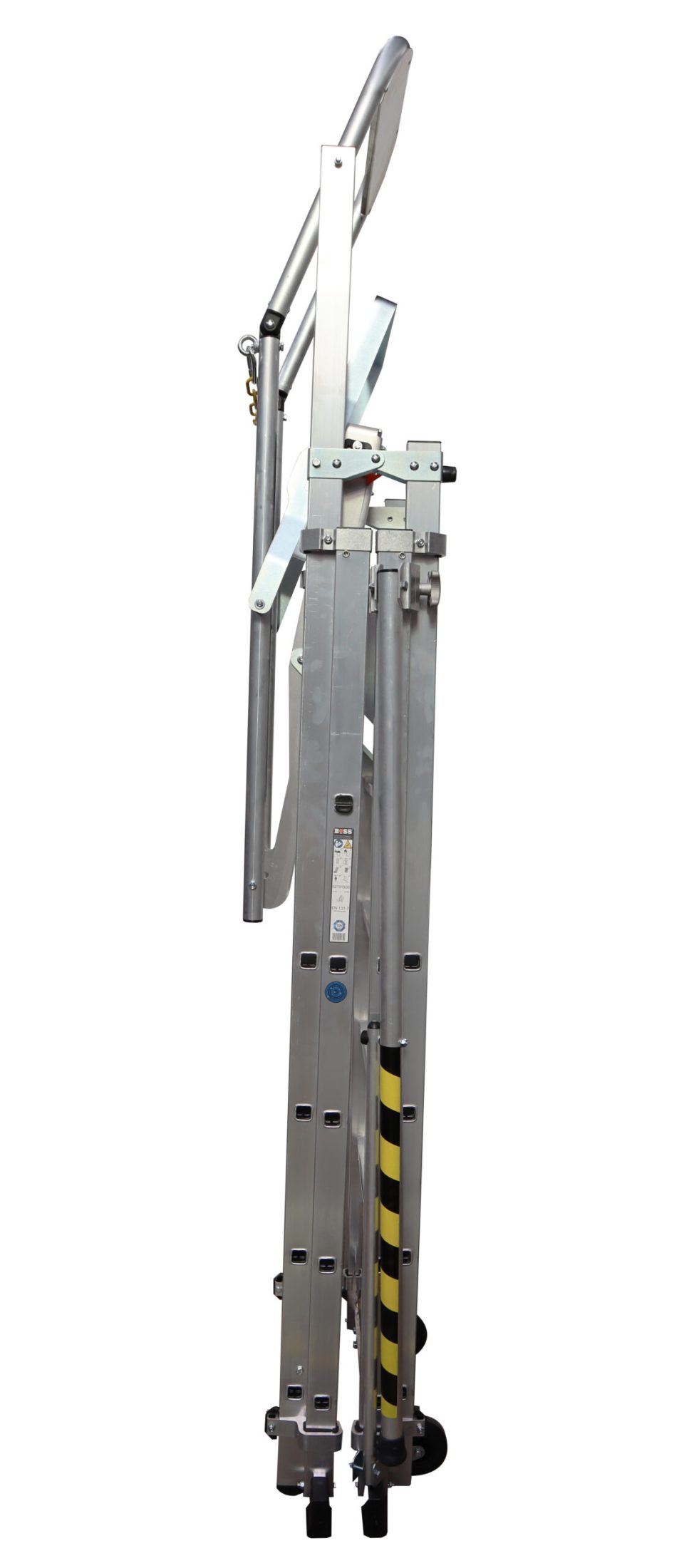 Four easy-to-deploy stabilisers prevent the risk of toppling and the simple rung-by-rung height adjustment requires only the upper part to move, leaving the stabilisers firmly on the ground at all times. It is easy to erect and dismantle single-handedly and a pair of rugged wheels allow easy movement when folded flat.