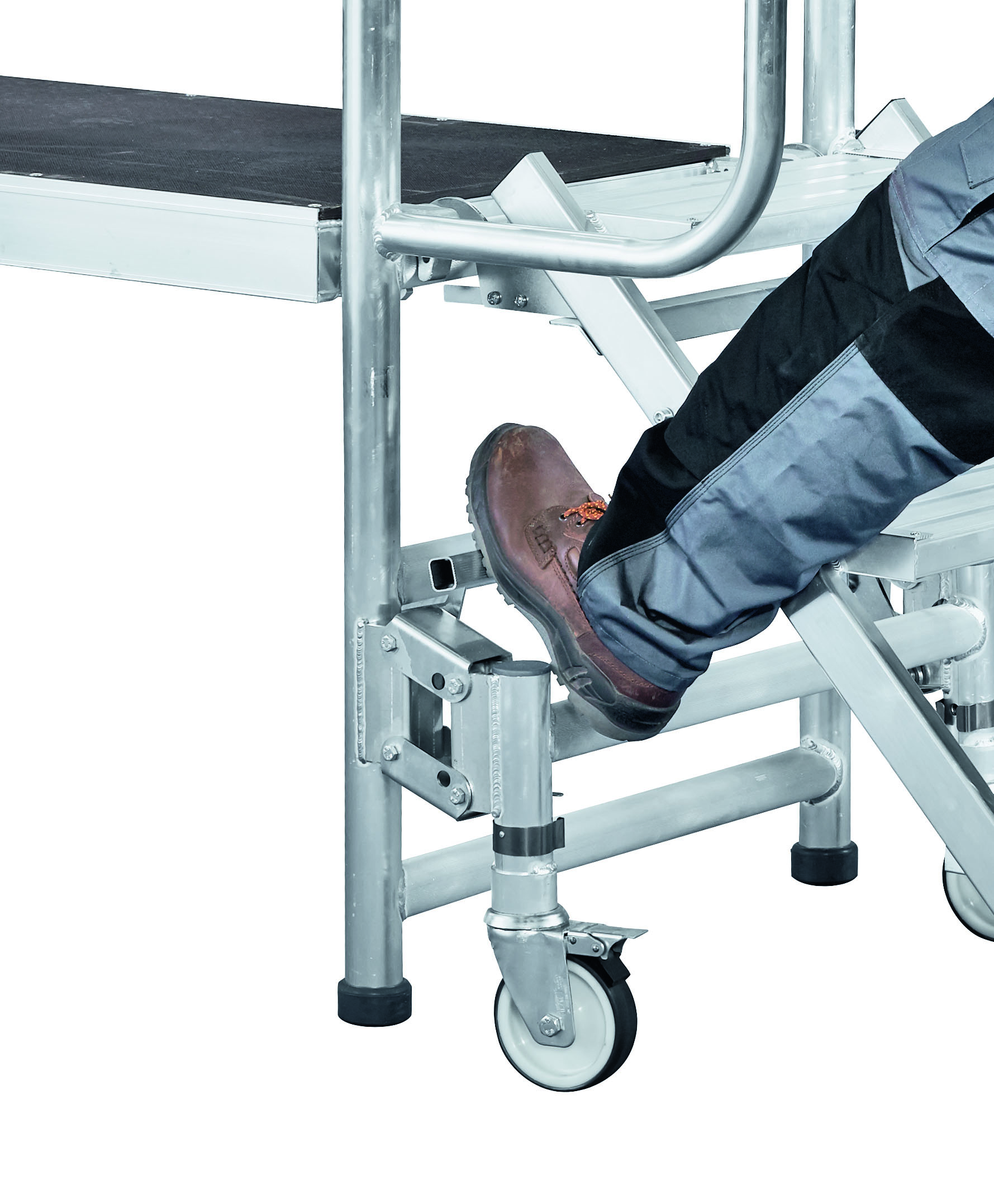 - Ready-for-use in no time through a central foot-operated brake on the access steps.